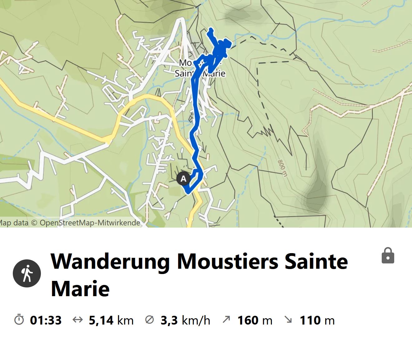 In der Nacht regnete es mal wieder kräftig und auch vormittags hörte der Regen nicht auf. Bei dem Wetter blieb man besser zuhause und so beschlossen wir, auf einen Campingplatz beim nahegelegenen Städtchen Moutiers-Sainte-Marie zu fahren, um dort die Annehmlichkeiten wie Strom und sanitäre Anlagen zu haben und in Ruhe und Sicherheit stehen zu können.