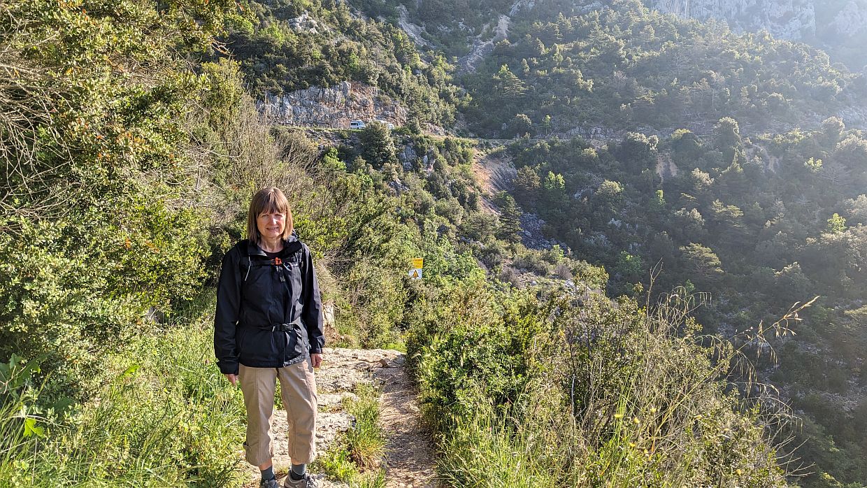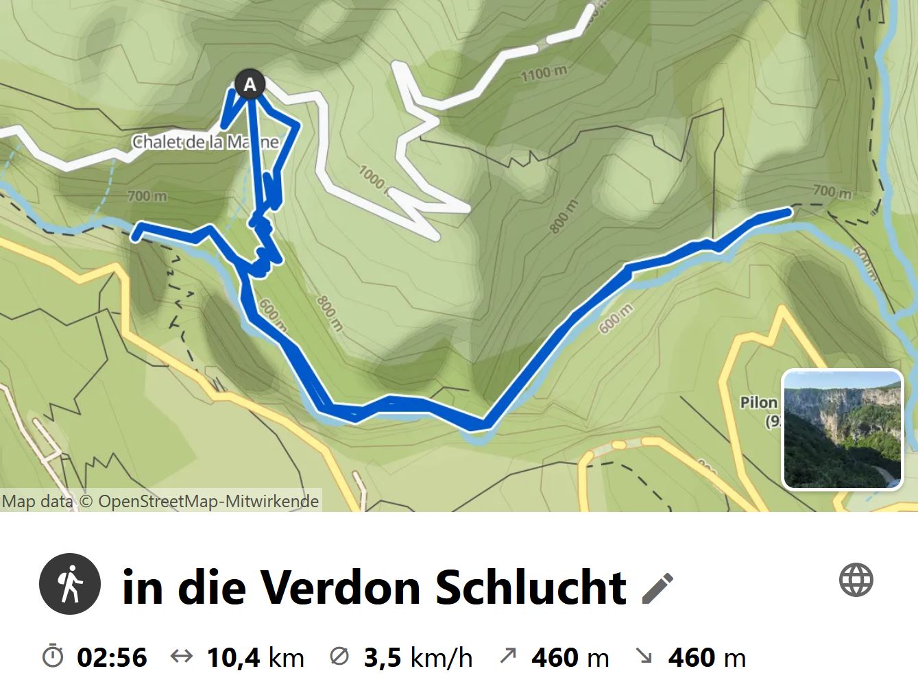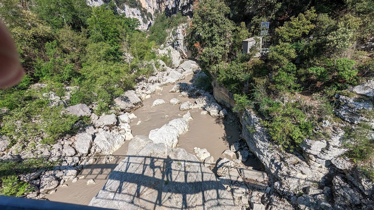 Eigentlich wollten wir bis zum Zusammenfluss von Verdon und L’Artuby wandern, aber das war dann doch konditions- und wettermäßig etwas zu viel. Um 11:30 Uhr setzten wir uns auf einen Stein und machten Vesperpause. Danach drehten wir um und gingen den ganzen Weg, bis auf den Abstecher zur Brücke, wieder zurück.
