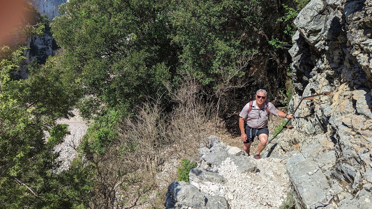Dann ging es wieder eine Stück zurück und weiter den Verdon entlang auf dem Sentier Martel. Wir waren etwas enttäuscht, da dieser Wanderweg als besonderes Highlight und zwar schwer, aber dafür besonders schön angepriesen wird. Allerdings geht man die meiste Zeit durch den Wald und hat bis auf wenige sehr schöne Ausblicke kaum Sicht auf den Fluss. Dieser war heute ganz schlammig-braun, gar nicht so schön blau wie auf den Werbebildern. Am Wendepunkt gab es natürlich eine Stärkung, mit Xenis leckeren Sandwitches.